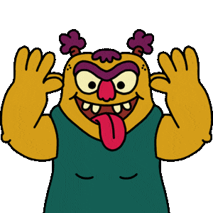 A mischievous cartoon monster sticks its tongue out and wiggles fingers by its ears, making a teasing face.