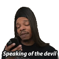 Tony Talks, wearing a wig, says 'Speaking of the devil' with a knowing look, perfect for when someone you're discussing appears.