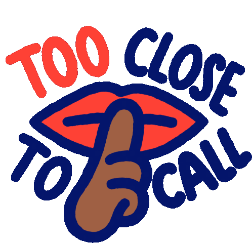 A pair of red lips with a finger making a 'shh' gesture, accompanied by the text 'Too Close To Call'.