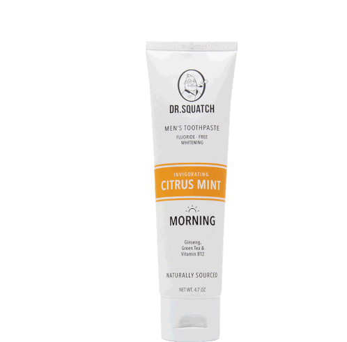 An animated sticker featuring a Dr. Squatch Citrus Mint toothpaste tube, highlighting its fluoride-free whitening and natural ingredients.