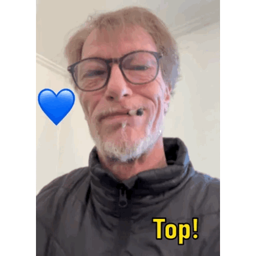 Man with glasses and beard gives a thumbs up, smiling, with a blue heart and "Top!" text, conveying approval.
