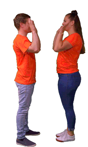 Two people in orange shirts doing a 'top top' hand gesture, celebrating success with a happy smile.