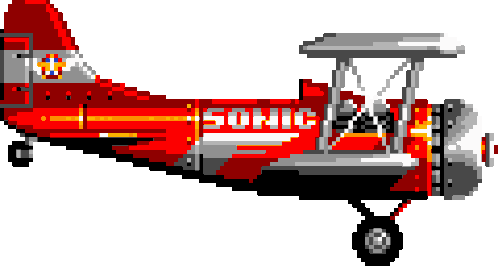 The iconic red biplane, Tornado, from Sonic The Hedgehog, flying through the air in pixel art style.