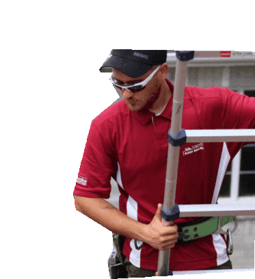 Animated sticker featuring a roofer transitioning into the Toronto Roof Repairs company logo with the city skyline.