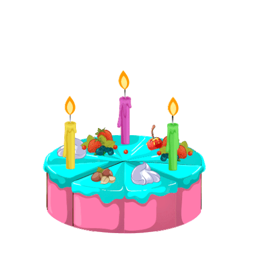 A colorful animated birthday cake with lit candles, fruit toppings, and a slice being removed and replaced.