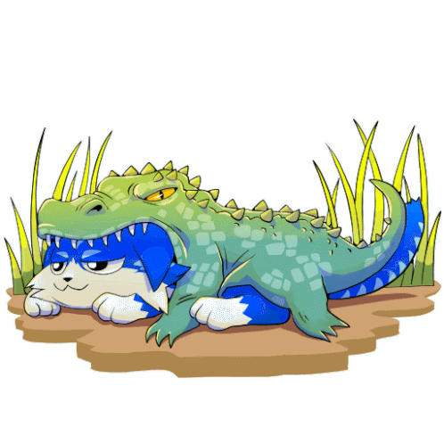 a cartoon drawing of a blue and white dog laying next to an alligator
