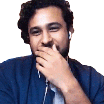 Abish Mathew smiles warmly, touching his mustache with a pleased expression, wearing earbuds.