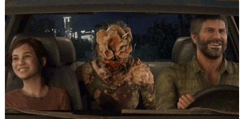 Joel Miller, Ellie, and a Clicker from The Last of Us are in a car, with 'Server Up' text. A humorous game reference.