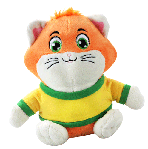 An adorable animated sticker of Meatball from 44 Cats, a plush orange cat wearing a yellow and green shirt, blinking and moving its head.