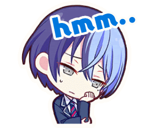 a cartoon of a boy with blue hair and the word hmm on his head .