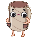 A sad, empty toilet paper roll character shrugs its arms, indicating a lack of toilet paper. It looks worried and helpless.