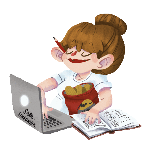 Srta. Sinfonier works and studies on her laptop, enjoying a bag of chips. A cozy scene of productivity.