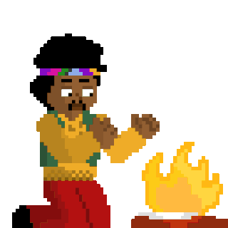 A pixel art animation of a man kneeling by a fire, warming his hands. The fire transforms into a flower, which he then holds.