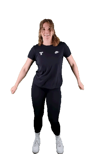 A woman in a black t-shirt and leggings performs an energetic training move, flexing her arms.
