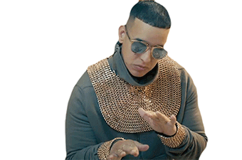 Daddy Yankee in sunglasses and gold collar, making hand gestures with a relaxed, 'tranquis' vibe.