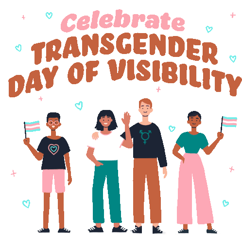 Celebrate Transgender Day of Visibility with a diverse group of trans people holding trans flags and showing solidarity.