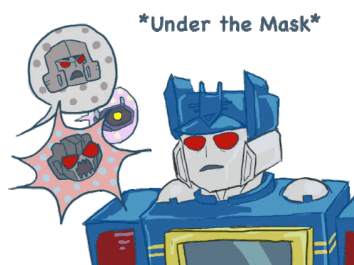 Soundwave from Transformers appears stressed, with thought bubbles showing Megatron, Laserbeak, and Rumble/Frenzy under his mask.