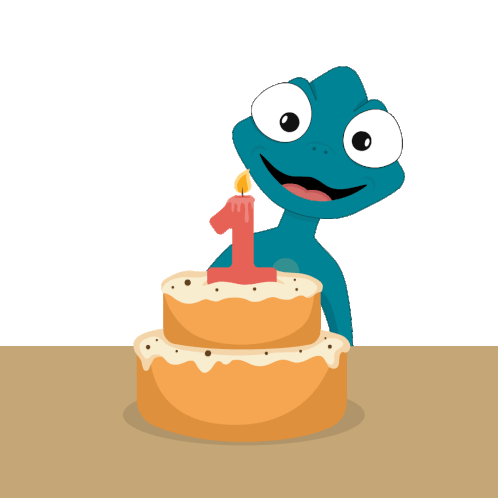 A cheerful chameleon from Translation Nomads celebrates a 1st birthday with a cake and candle.
