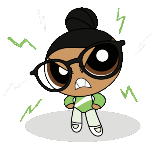 An angry Powerpuff Girl-style character, MrsGiffie, with glasses and a bun, showing her frustration with green lightning.