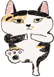 Gigi the calico cat performs a grumpy dance, standing on one leg with paws together. A transparent animated sticker.