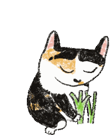 A happy calico cat, Gigi, stands with closed eyes, contentedly chewing on a piece of cat grass, with bubbles floating around.