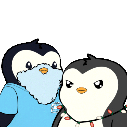 Two adorable Pudgy Penguins, one with a beard and the other with Christmas lights, share a moment with the phrase 'Patience Young Grasshopper'.