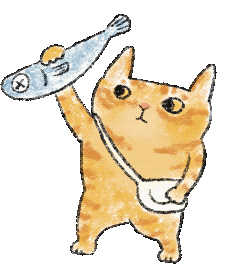 An adorable transparent ginger cat sticker, first proudly holding a fish, then preparing it with a knife.
