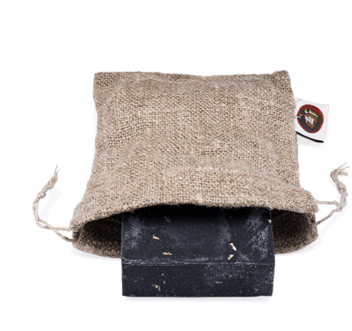 A textured travel bag with a black bar of Dr. Squatch soap peeking out, perfect for on-the-go hygiene.