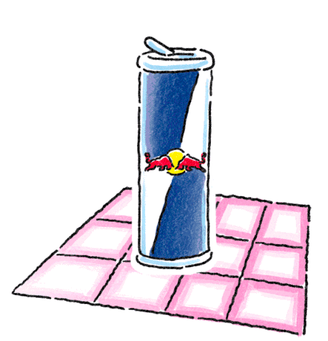 An animated Red Bull energy drink can dances and spins energetically on a pink checkered surface.