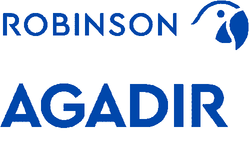 A blue and white logo for ROBINSON AGADIR, a travel and holiday club, featuring a stylized bird head.