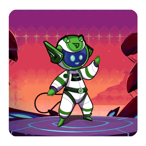 a cartoon character wearing a green and white striped space suit with the letter p on it