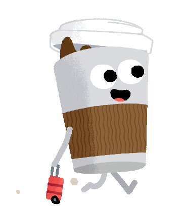 A cheerful animated coffee cup with a suitcase runs, spilling a little coffee, ready for a journey.