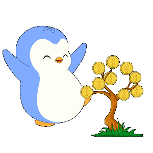 A cute pudgy penguin happily collects gold dollar coins from a money tree, symbolizing wealth and financial growth.