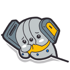 A sad, sick-looking dog character wearing a grey knight's helmet, with a white puff from its mouth, part of Trimble Geospatial stickers.