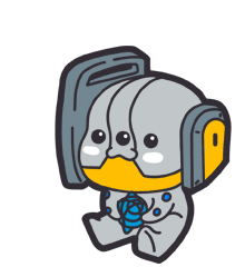 A cute cartoon robot, possibly the Trimble X7 mascot, sitting and holding a glowing blue object, representing geospatial technology.