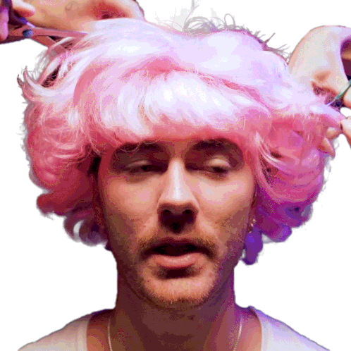 Cian Ducrot with a vibrant pink curly wig, as hands are seen playfully trimming or adjusting the hair.