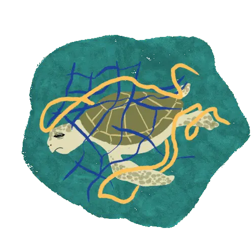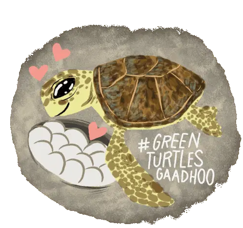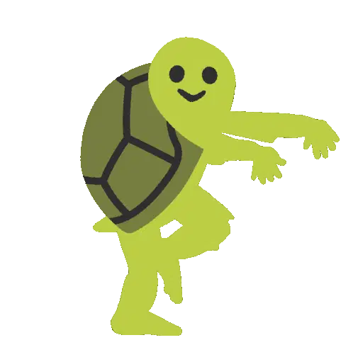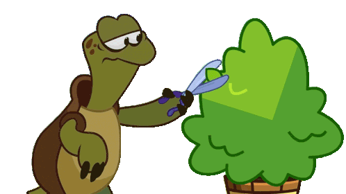 A cartoon turtle carefully trims a vibrant green bush with scissors, looking a bit weary while gardening.