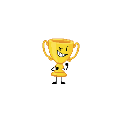 Trophy II from Inanimate Insanity, a pixel art golden trophy character, floats and grins mischievously.