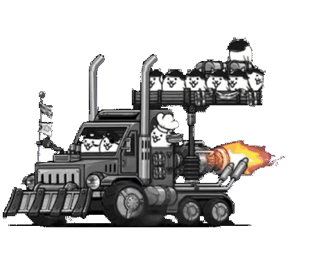 An animated sticker featuring a powerful battle truck driven by cats, equipped with a fiery rocket booster and carrying more cat soldiers.