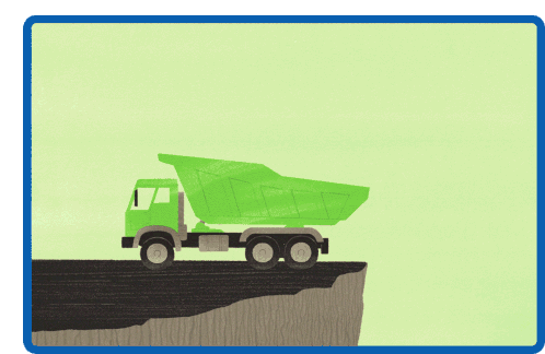 A green dump truck sits precariously on a cliff edge as a red graph line dramatically falls, symbolizing a decline.
