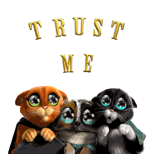 Puss In Boots, Kitty Softpaws, and Perro from The Last Wish show their adorable pleading eyes with "TRUST ME" text.