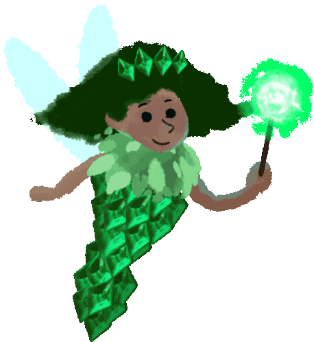 A cute green fairy from Truth And Tales, with a crown and magic wand, smiling and flying.