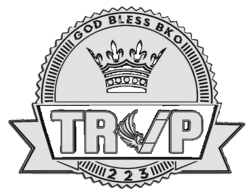 An animated 3D logo sticker featuring 'TRVP_223' and 'GOD BLESS BKO' with a crown, rotating smoothly.