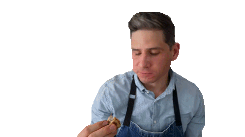Brian Lagerstrom tastes a piece of chicken, showing the inside of the cooked meat.