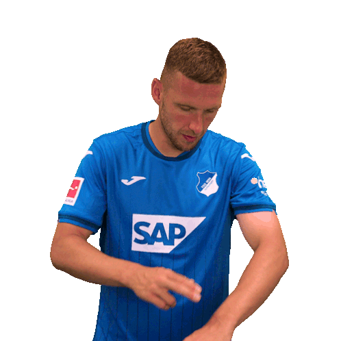 Pavel Kaderabek, wearing his TSG Hoffenheim Bundesliga jersey, makes a 'time' gesture, pointing to his wrist.