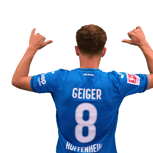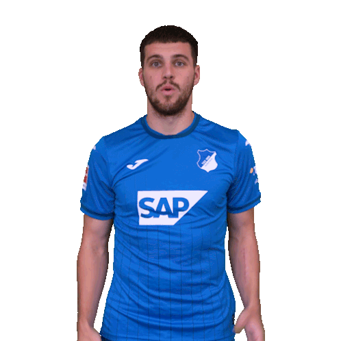 David Jurasek, wearing his TSG Hoffenheim jersey, shrugs with a questioning expression, hands open in a gesture of confusion.