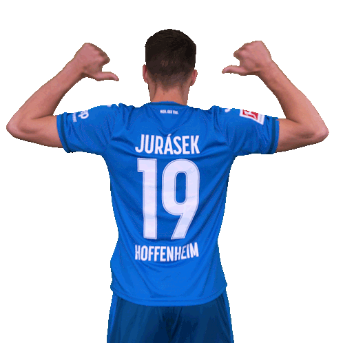 David Jurasek, a Hoffenheim football player, shows off his number 19 jersey from behind, with thumbs pointing down.