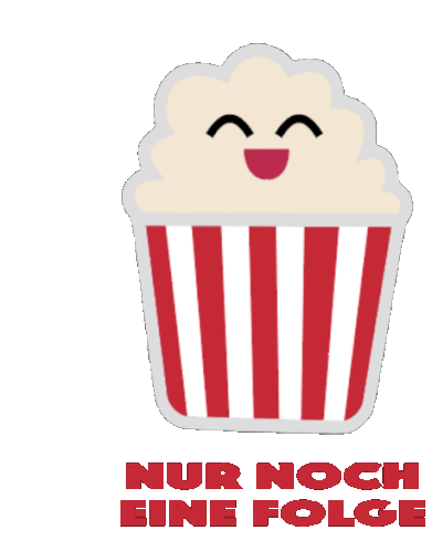 A cute popcorn bucket with a happy face and heart eyes, accompanied by the German text "Nur noch eine Folge" (Just one more episode).