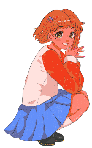 Animated sticker of an adorable anime girl with orange hair, squatting and winking, with sparkling effects. By Tsu Nami.