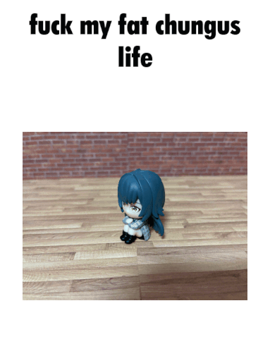 Tsukimura Temari Gakumas figurine sits on a wooden floor with a brick wall background, expressing 'fuck my fat chungus life'.